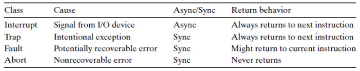 Examples: 1. IO interrupts(ctrl-c). 2. hard reset interrupt(reset button). 3. soft reset interrupt(ctrl-alt-delete).