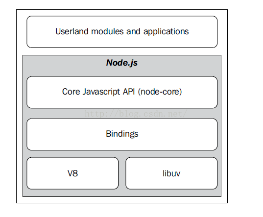 由上图可知,nodejs包括顶层的javascript(程序员层面)和底层的V8, libuv(底层io实现)。