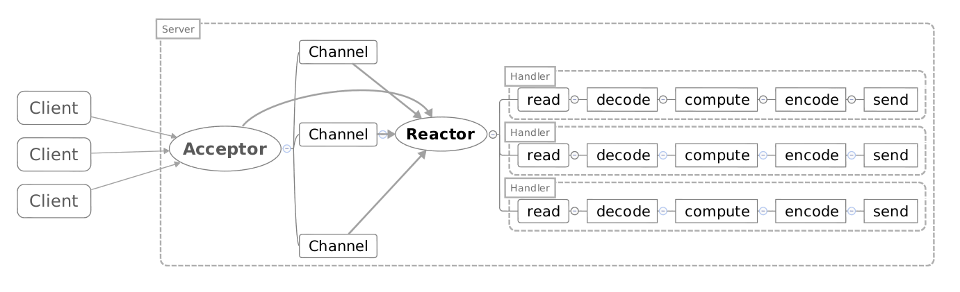 - 通过service handler同步的将输入事件(event)采用多路复用(select/poll/epoll)分发给相应的request handler同步的将输入事件(event)采用多路复用(select/poll/epoll)分发给相应的request handler处理。