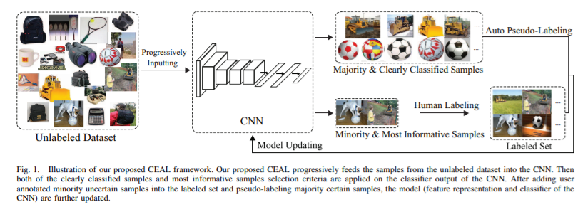 如图所示,这个框架先是从零开始。即DL(labeled set)为空。然后,迭代以下算法:每次选取一些unlabeled sample放到classifier中,如果置信度高,则直接使用pseduolabel,否则,使用人工标注。